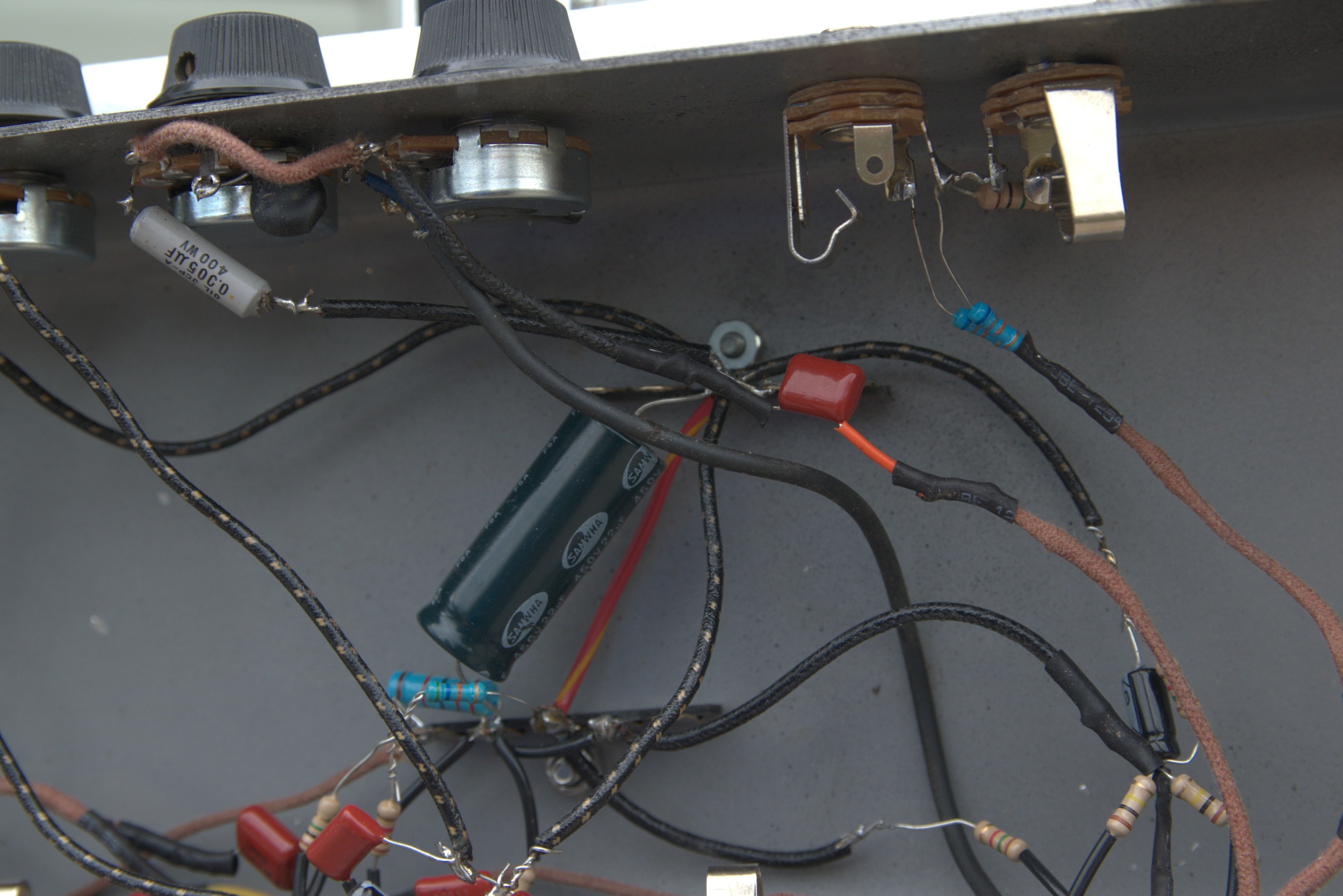 Guitar signal enters at the Bright Hi input jack at upper right. The signal splits and flows through both 68k grid stopper resistors to tube V1 pin 7 (preamp V1B grid). The signal leaves V1 through pin 6 (V1B plate) and a .01uF coupling cap to the Bright Volume pot. The coupling cap prevents high voltage DC on the plate from getting through to the volume and tone controls. The volume pot and tone controls bleed guitar signal to ground to control the volume and darken the tone. The guitar signal leaves the control circuit through the Normal Volume pot pin 3 and flows down to V2 pin 2 (preamp V2A grid). The signal leaves the tube via pin 1 (V2A plate) and flows through a coupling cap to the other side of tube V2, pin 7 (V2B grid). The coupling cap keeps high voltage DC off the V2B grid. V2B is the phase inverter and it splits the guitar signal in two. One signal leaves through pin 6 (V2B plate) and flows through a coupling cap to power tube V4 pin 6. A second, opposite phase signal flows out of V2B pin 8 (cathode) and flows through a coupling cap to power tube V3 pin 6. The power tubes' pin 6 has no internal connection and serves only to hold the 1.5K grid stopper resistor. The signal flows through the grid stopper resistor and into the power tubes at pin 5 (grid). The guitar signal leaves the power tubes via pin 3 (plate) and flows into the output transformer primary winding. The signal couples with the output transformer secondary and flows out to the speaker jack. Simplified Point-to-Point With No Standby SwitchThe worthless standby switch has been removed which allowed some simplification and optimization. I used a simple three-point grounding scheme with the first two filter caps' ground isolated. The "Cap Ground" and "Power Amp Ground" tag strips are grounded to the chassis. The preamp ground at lower right is grounded through the black wire connected to the Normal Hi input jack at upper right--the tag strip's center ground terminal is not used.