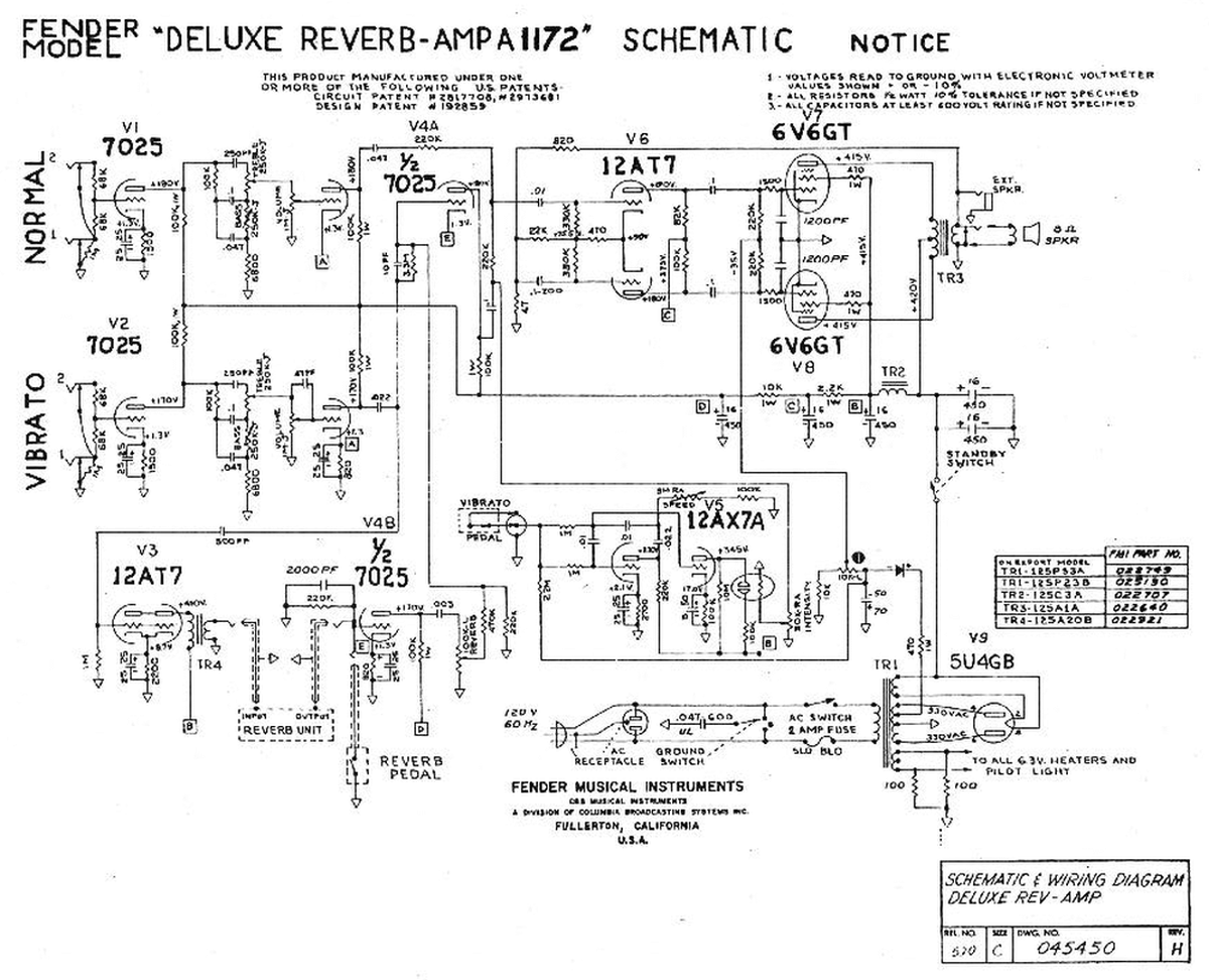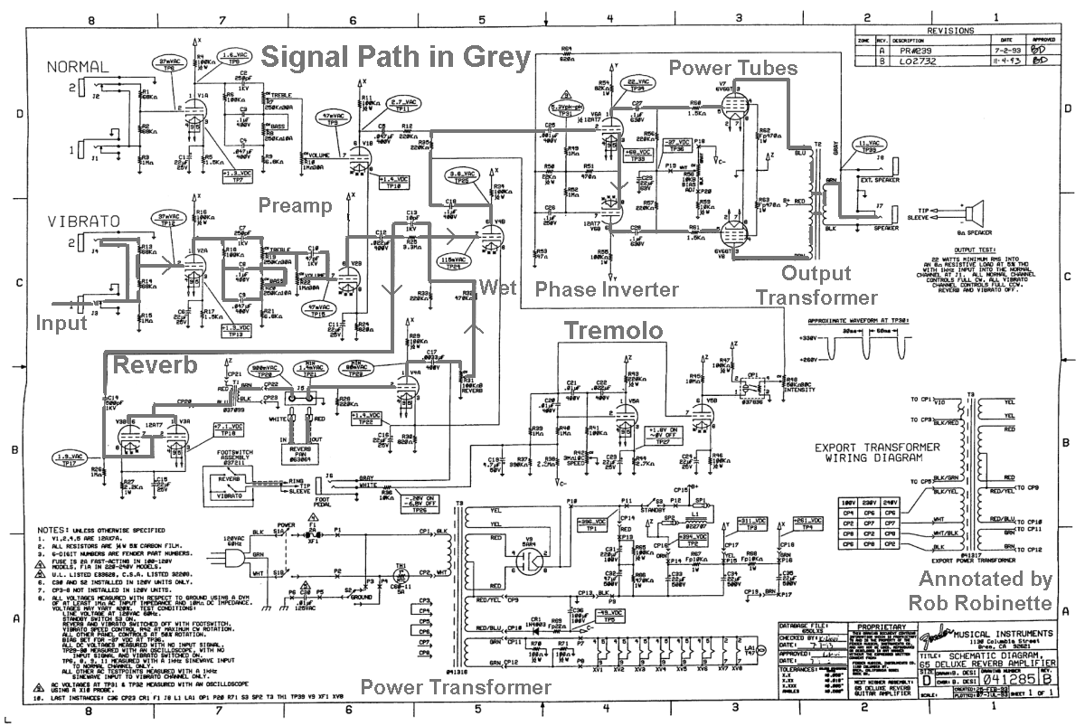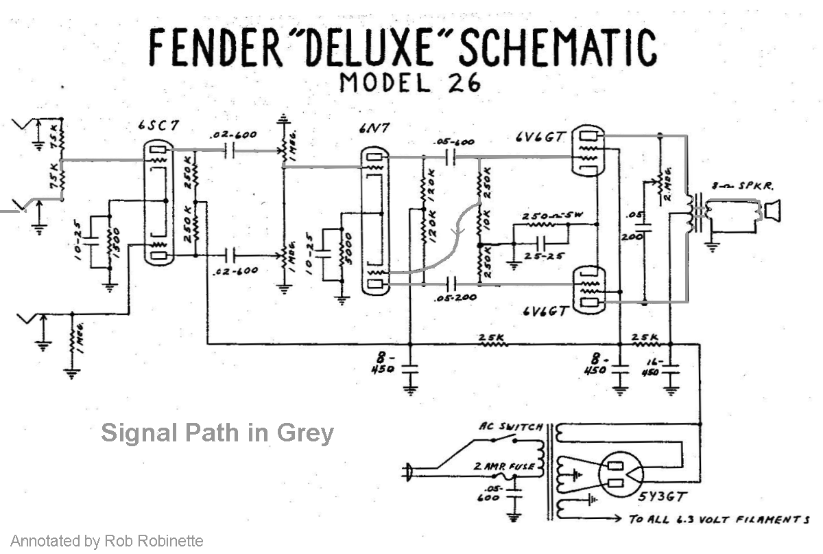 Both volume pots, both phase inverter caps and the V1 preamp are different from a standard 5E3 Deluxe.
