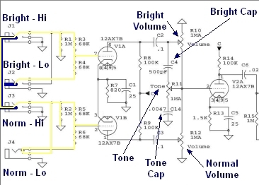 Bright Hi and Lo are the Bright/Instrument channel because of capacitor C4, the 'Bright Cap,' (see graphic below) which boosts high frequencies by bypassing them around the Bright Volume control. The Bright Cap only functions at lower volume levels so it's usually preferred for lower volume playing. If you find the Normal channel too dark at low volume try the Bright channel. Note that the only difference between the Normal and Bright channels is the Bright Cap and at max volume there is no difference between the Bright and Normal channels.