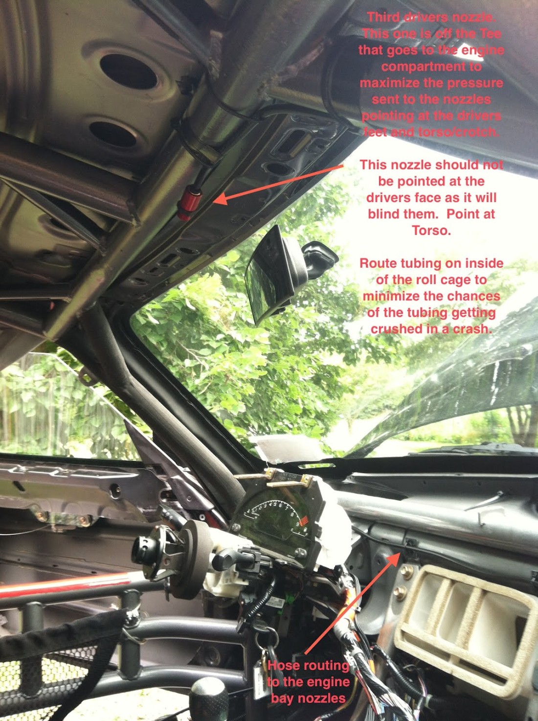 S2000 Fire Suppression System InstallBy Matt BriddellOnly a fire extinguisher is required by most racing organizations but a fire suppression system can save your life when things go really wrong. Here's how I installed a system on my S2000 racecar. The installation involves mounting the fire extinguisher bottle and routing flexible plastic lines to nozzles distributed through the cockpit and engine bay. Some systems have remote activation switches to make the system easy to fire for the driver and course workers. Suppressant Line Routing in Cockpit
