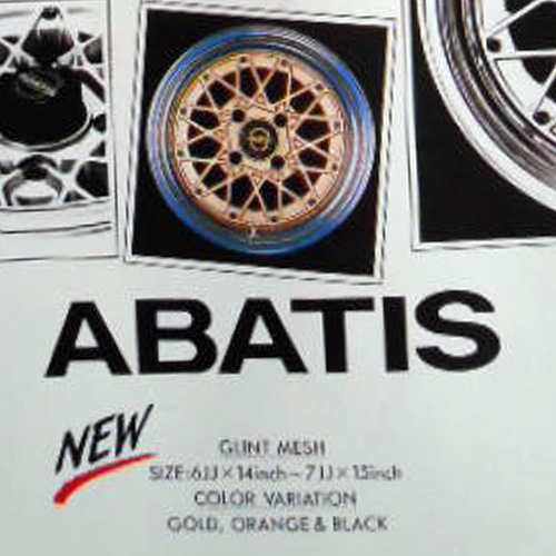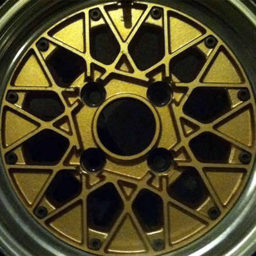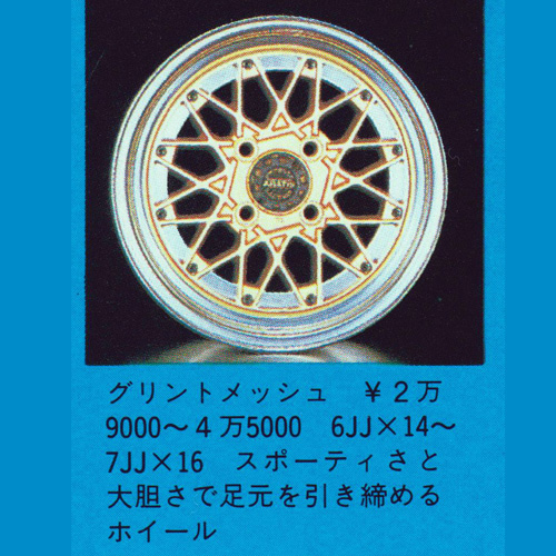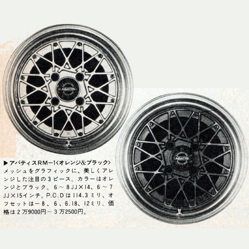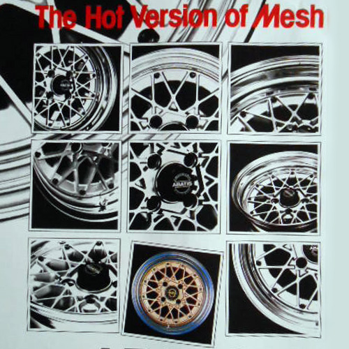 Seen with the model names RM-1 and Glint Mesh, the original model of this wheel came in colours gold, orange and black with polished highlights. The later Glint Mesh Z, had a slightly different model name, and special colour: orange highlights on and black background. Size offerings were relatively medium 14 and 15 inch with 4H PCD114.3 only. Fourteen inch wheels showed a slightly different mesh pattern with the absence of a cutout between the shell section and the mesh spokes.