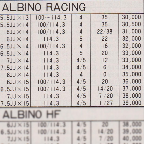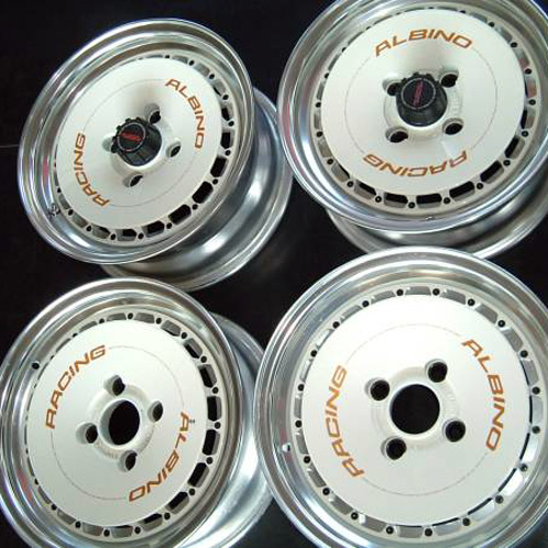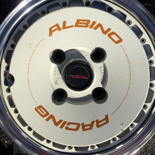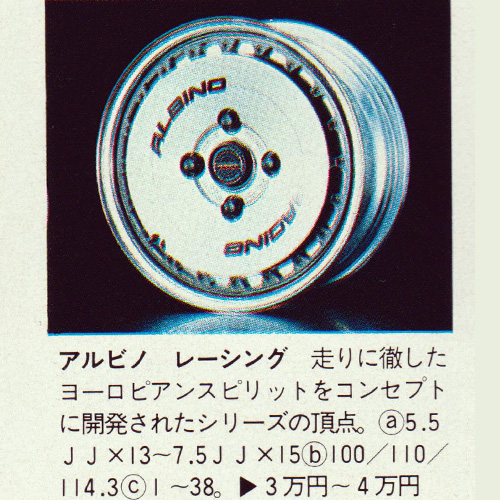 The centre caps were especially unique, using a lightweight plastic MESH with fine holes drilled in them, and a text that reads, “The Fast Run-Running For Albino Racing – Weds Design Div.”