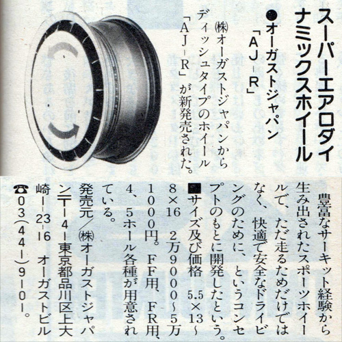 The AJ-R belongs in a group with the rarest of the rare. We’ve never observed a real life set, and they are even a challenge to find in catalogs and magazines. The wheel is often referred to as the August Japan Super Aerodynamics, but it seems the model name was actually AJ-R. Real aerodynamic gains are claimed to come from an aero-cover, which fits over top of what is said to be a “dish” type wheel.