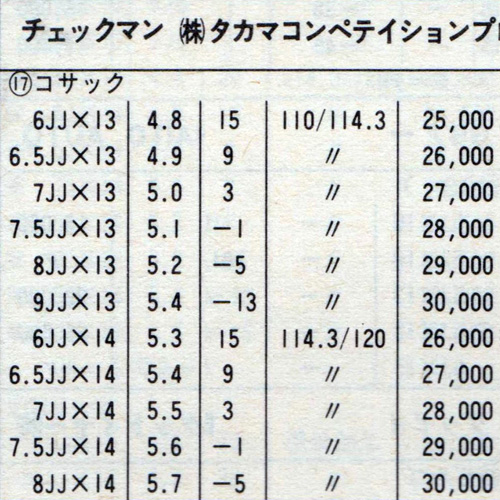 Built by Enkei for Checkman Racing. Of a few Checkman wheel models, the Cossac G is by far the most sought after, but it doesn't typically reach the crazy prices that other Checkman parts reach on the used markets today. Sizes are mid width, but at 5.4kg for 14 6J size the wheel is quite lightweight for the era.