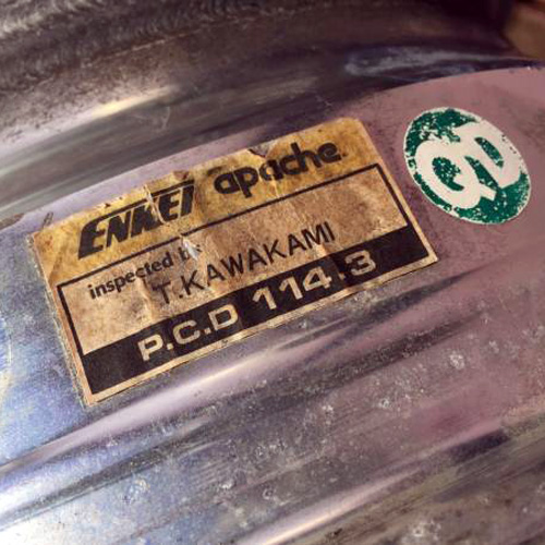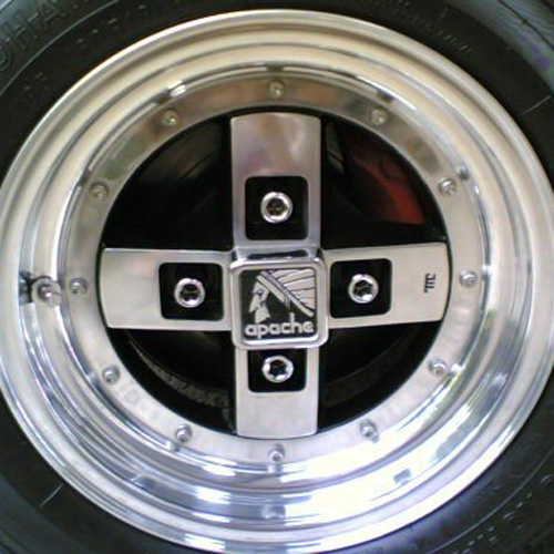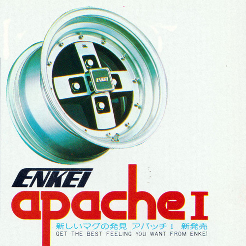 The Enkei Apache line launched in late 1978 with the first version having sharp flat spokes and a very “square” appearance. The center cap even had four flat sides, although the five hole (and five spoke) version of the wheel got a conventional round centre cap. Early centre caps simple said “Enkei”, while later ones used the image of a traditionally dressed Native-American man. (If I am being politically correct, Enkei certainly was not at the time.) Advertisements for the wheel used the same imagery, and talked about rebels and war.