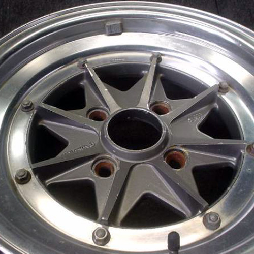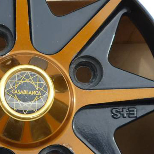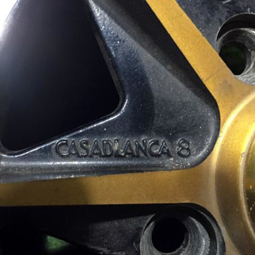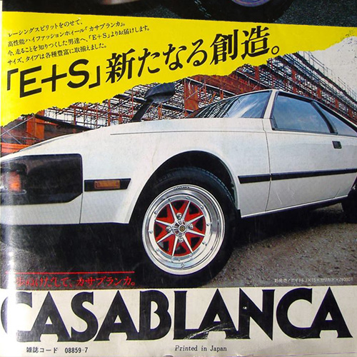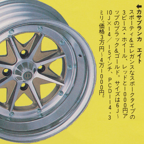 Like the Casablanca mesh, the spoked Casablanca 8 was made by Speed Star Co. for Shop E+S. The 8, came in diameters one inch bigger than the mesh, with widths up to 10J. Colours were silver/gold, black/gold and red/silver.