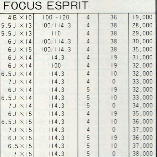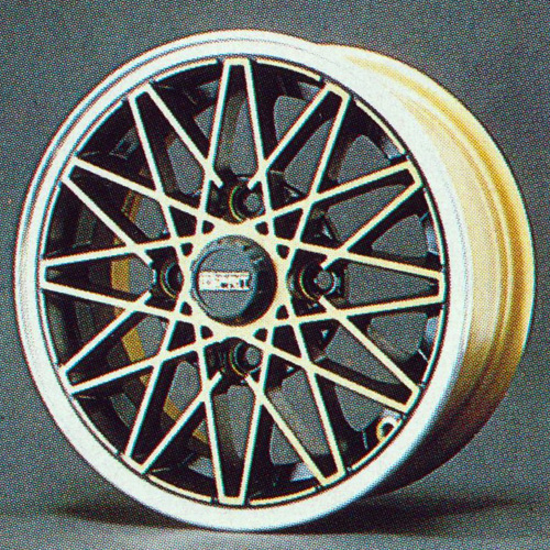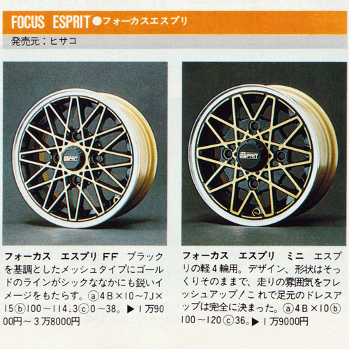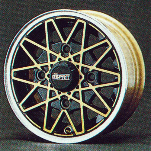 Come from Hiseko, as part of the Focus line, the Esprit was a single piece cast wheel with simple flat lip, and contrasting gold and black face. The production was handled by Kobe Steel. Original production in 1982 consisted of 13 and 14 inch FR type sizes. In 1983 FF, and Mini sizes were added.