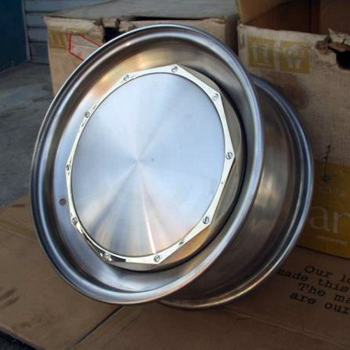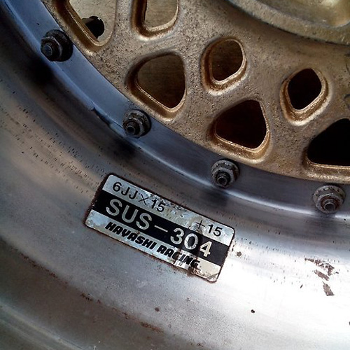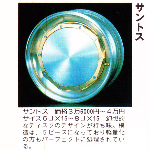 The Hayashi Racing Santos (sometimes Santos Sunboss) is a simple mesh wheel that comes with a beautiful polished aero cover that fits over four extended wheel assembly bolt pins.  Hayashi describes the wheel as a five piece design, with the wheel itself, a typical three-piece mesh design with front mounted centre.  Detailed images of the disk have not been seen, but from Hayashi’s description, we might assume that it itself is a two piece design, with the brushed aluminum centre section being separate from the gold coloured rim section that holds it down.