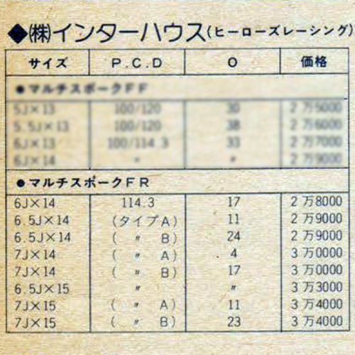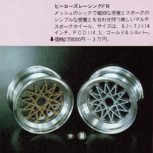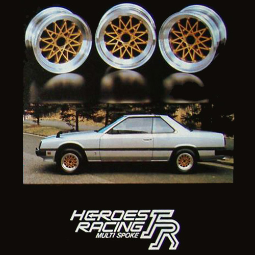 The second wheel from the Heroes Racing brand, was the Multi Spoke, which launched in 1981 with three sub models: the FR, the FF and a Mini version with 10 and 12 inch diameters.  The FR came in 14 and 15 inch, with 4H PCD114.3 being the only option.  Colours were gold and silver.