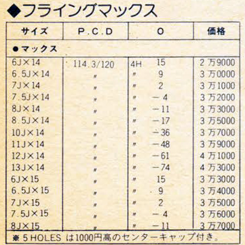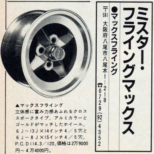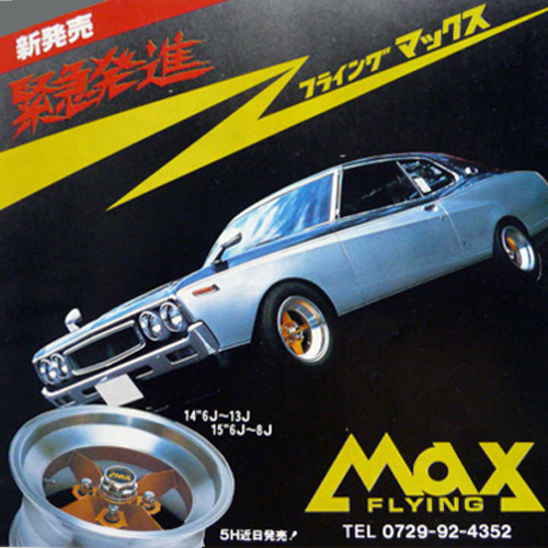 An unobtainable wheel, seen in catalogs only. The Mr. Flying Max, Max Flying was produced in conjunction with Devil Japan, but most advertisement and catalogs don’t link back the bigger more well known brand. Fourteen and 15 inch diameters only, with some big widths. Custom 5H PCD was reportedly available, but how that works with a 4 spoke casting is unknown.