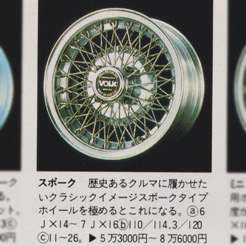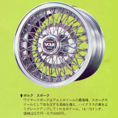 Two different style centre caps were available, with a wider centre disk being offered post 1985. Dubbed, “for high-class cars” the Volk Spoke also carried a very high class price tag. In 1983 the MRSP was 66000円 making it twice as expensive as other Volk wheels at the time.