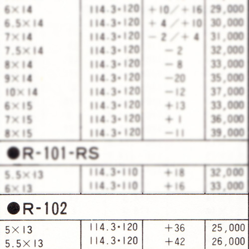 The R-102 was a front wheel drive specific variation of the R-101. The wheel used a front mounted centre, and came in thirteen inch diameters only. Colours were either black or gold. The wheel weighs 4.8kg in 13 5.5J size.