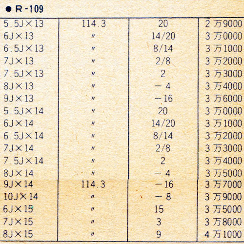 The R-109 and five hole R-110 were late additions to the River Side R line up. Colours available were silver, black, red and gold. Like other wheels from the line-up, it is as light as anything of the time. 14 6J sized examples are about 4.8kg. Unlike other wheels of the line up, the R-109 was available in 4H PCD114.3 only.