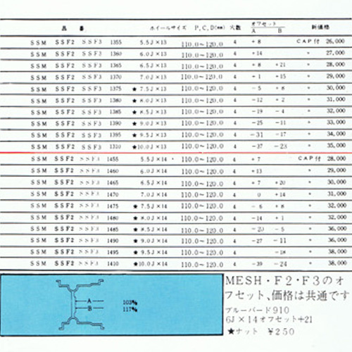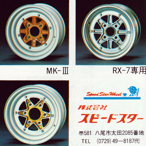 The F.3 is extremely similar in design to the more common Mk.3, and very often mistaken for its brother.  The F.3. shared sizing options with the F.2. and Star Mesh, with the standard F series colour options of silver, red, orange, gold and black.  The F.3. is sometimes referred to specifically the Speed Star RX-7, with an SA22 specific size of 13 6J +19 offered, and featured in some advertisements at the time.
