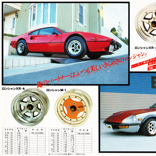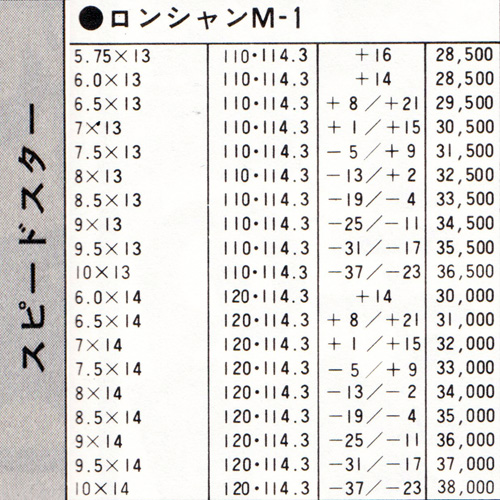 The Long Champ M-1 is the first three-spoke wheel to appear in the JAWA Bible with release date in May of 1979.  With a relatively short production period (appears to have been less than three years), the wheel is quite rare today, and a favourite of three spoke lovers.  The design and marketing of the wheel was done by Suzuka Sangyo, who left production up to Speed Star Co.  That meant beautiful Speed Star quality, and wonderfully aggressive sizing options.  The wheel was available in 13 and 14 inch diameters, with width up to 10J! Red and Silver centre sections were available, as were unique black shell sections, for an extra cost of 1000円 per wheel.  Only 4H PCD was offered: 114.3 and 120mm.