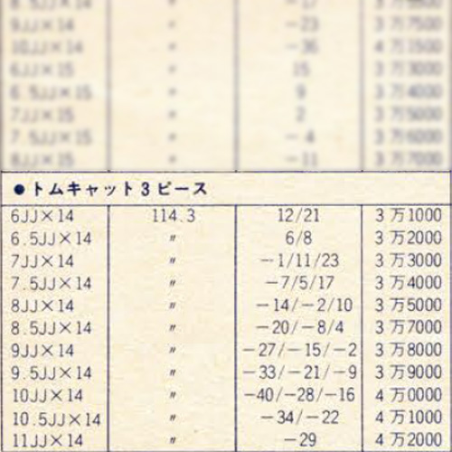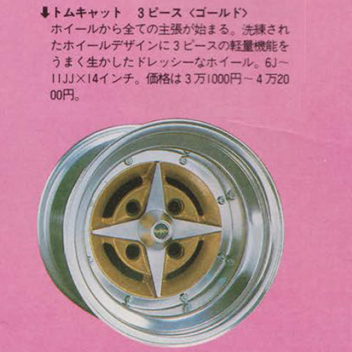 Produced by Speed Star Co. Ltd. for Tomcat Speed, the 3-Piece version came in 14″ diameters and 4H PCD114.3 only. As the advertisements which feature bubble flared R30’s suggest, the wheel was a popular choice for the shakotan crowd from launch. With a relatively limited production run, and involvement from the great Speed Star company, this is still a highly sought after kyusha wheel today. Available colours were red and gold.