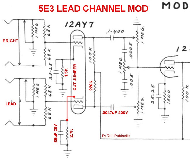 Add a 470KΩ 1/2 watt grid stopper resistor to the V2B phase inverter (V2 pin 7) to smooth out its overdrive. I recommend this mod be done to all 5E3 amps. It won't affect the amp's clean tone but it will keep the overdrive tone sweet when pushed hard. Actually this is a good mod for any guitar amplifier that uses a cathodyne phase inverter like the 5E3.