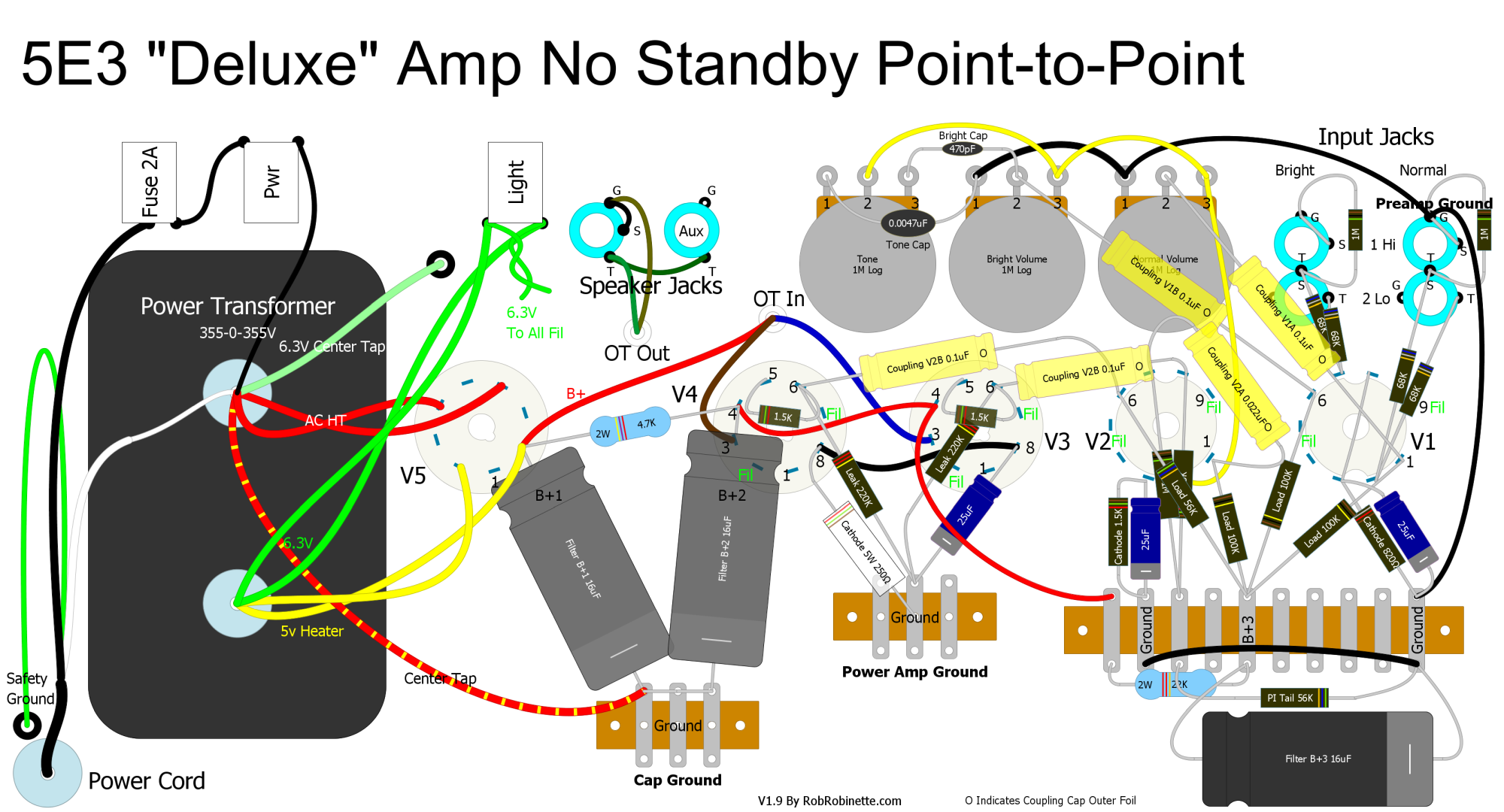 If you want to build your 5E3 Deluxe Old, Old School. Point-to-point wiring minimizes wires by using components to make connections when possible. Click on the layout to see the very large, full size layout. Components are anchored to the chassis with terminal tag strips.