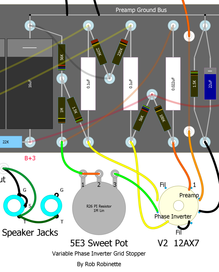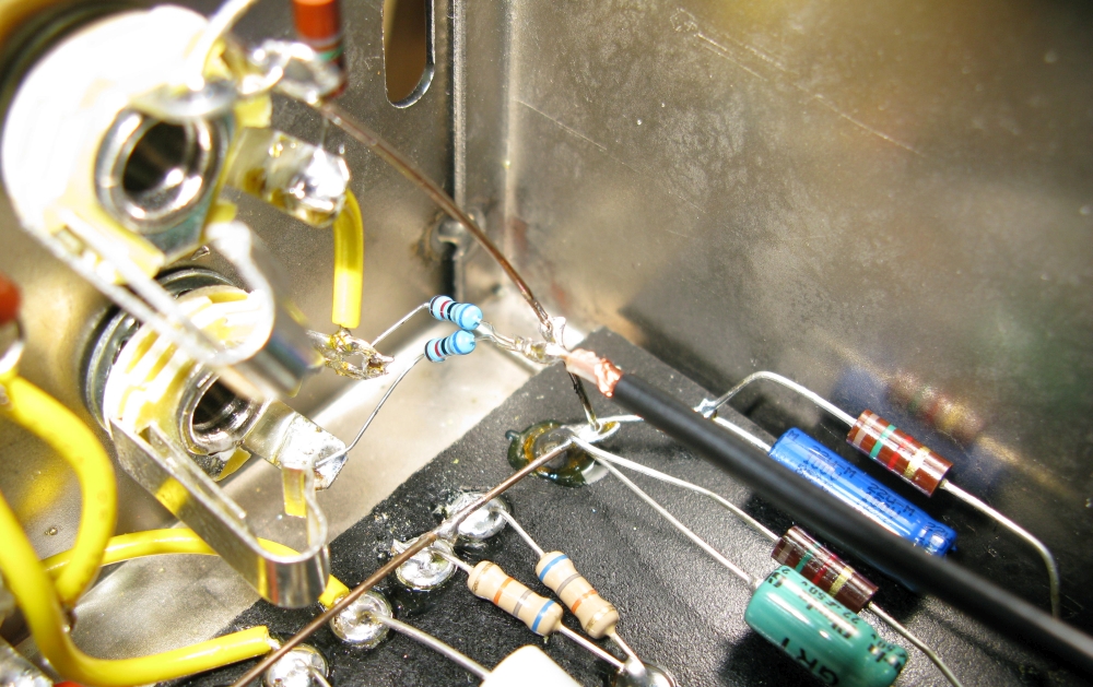 470K resistor added to the phase inverter input to reduce odd sounding double frequency phase inverter overdrive distortion.