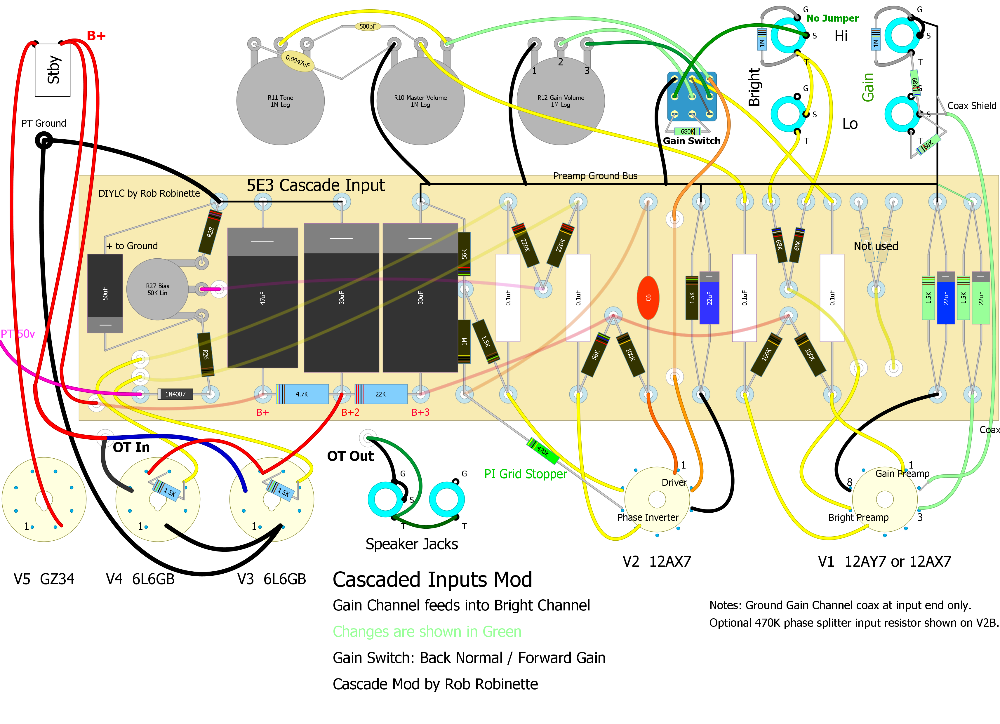 I believe a better solution to the phase inverter distortion problem is to forget the grid stopper mod and simply replace the 1M grid leak resistor with a 1MA pot to create a PRE Phase Inverter Master Volume pot which will allow you to fine tune the grid stopper & grid leak resistor sizes to really control phase inverter distortion. By turning down the master volume by about 1/3 you do the same thing as adding a 470k grid stopper and 470k grid leak to the phase inverter. The nice thing about this master volume is when it's set a max the 5E3 circuit is unchanged from stock.