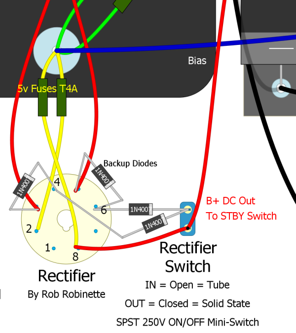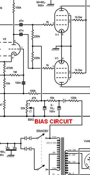 The fixed bias circuit is made up of one 1N4007 rectifier diode, one 1k 1/2 watt resistor, one 27k 1/2 watt resistor, a 50k linear pot and a 50uF 150v filter capacitor (see left end of the circuit board in the layout diagram below).