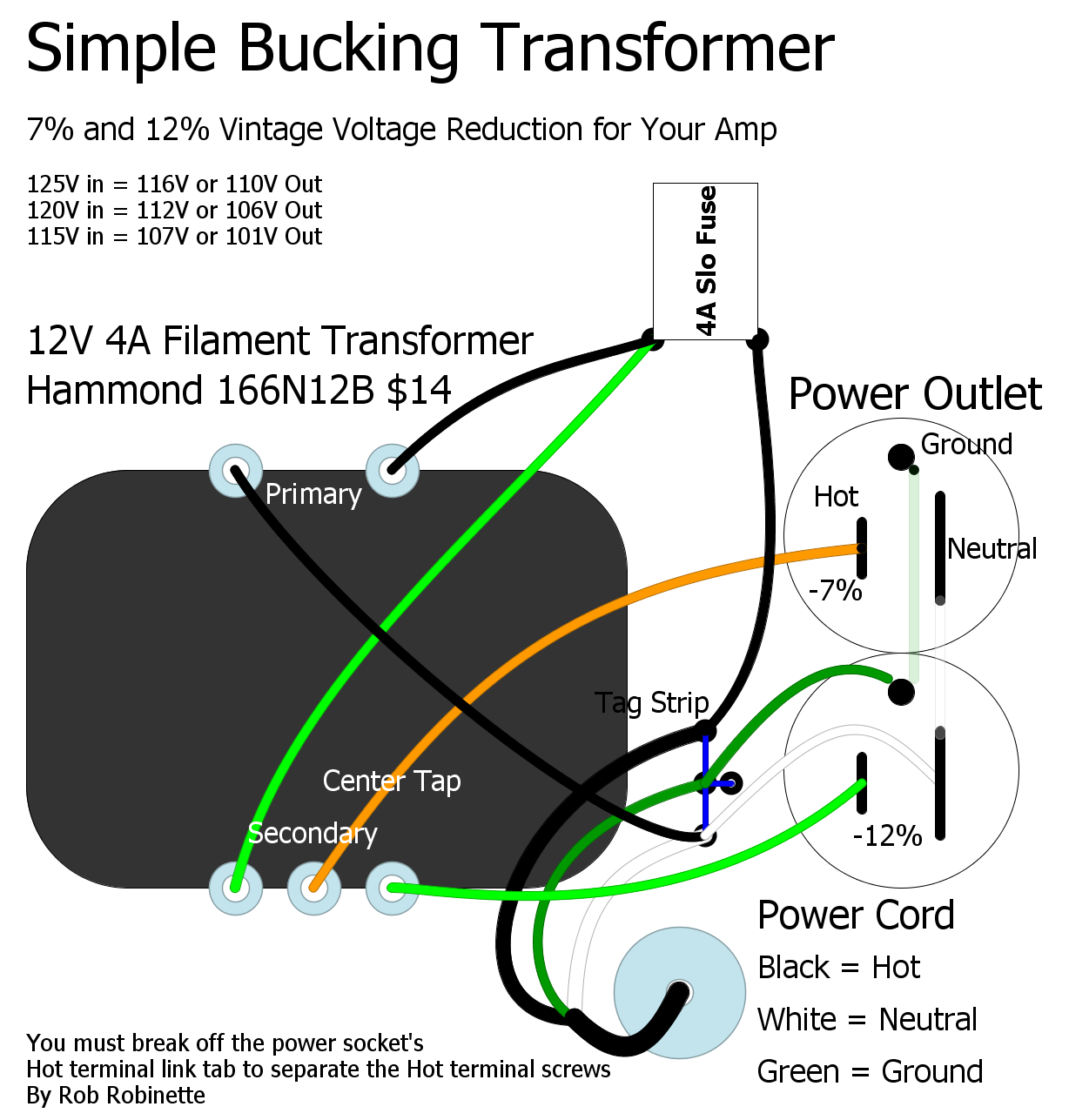 Photo shows a 166N6 6.3v transformer. I tried this transformer but got only -3.7% and -7% voltage reduction so I swapped it out for a Hammond 166N12B 12v 4 amp transformer and got -7% and -12% voltage reduction.