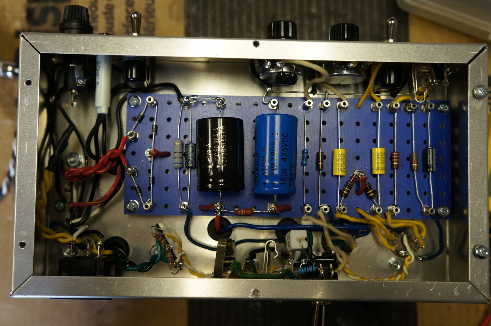 David's Champ Micro uses solid state rectification (4 diodes at left end of blue circuit board) so only two tubes were required.