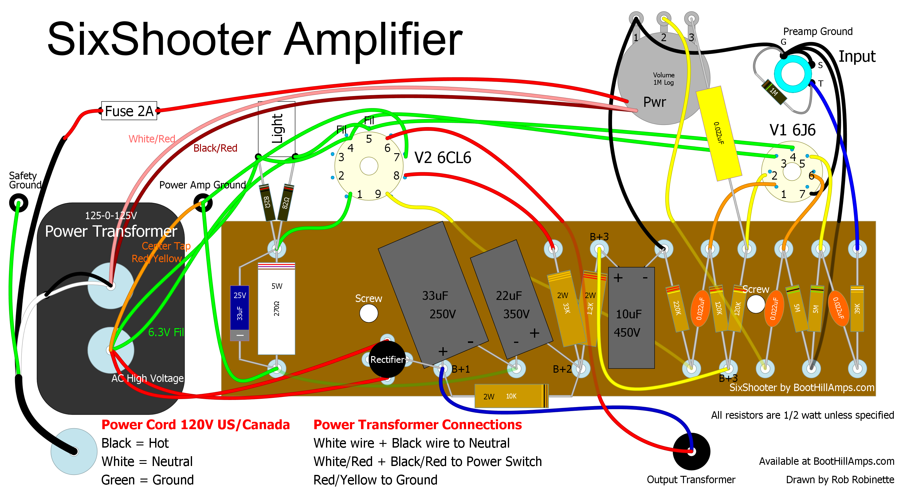 [ How the 5E3 Deluxe Works ] [ Deluxe Models ] [ DRRI & 68 CDR Mods ] [ Amp Troubleshooting ] [ My 5E3 Build ] [ Spice Analysis ] [ The Trainwreck Pages ] [ Fender Input Jacks ] [ B9A Prototype Boards ] BootHillAmps.com SixShooter BuildThe BootHillAmps.com SixShooter tube guitar amplifier is a cool little practice amp that uses just two tubes, a 6J6 preamp and 6CL6 power tube, to deliver a uniquely sweet tone that will inspire your low volume practice sessions. Dave Whalen of Boot Hill Amps designed the amp with grid leak bias for the preamp and driver circuits to give the amp its unique voice, early breakup, touch sensitivity and round tubey warmth. Total output power is less than 2 watts so it's a perfect "bedroom" amp. If you'd like to order a kit follow this link: www.tdpri.com/forum/vendor-forum/592510-six-shooter-guitar-amp-kits-boot-hill-amps.html Click the image to see the hi-res PDF schematic. The international 240V schematic can be seen here. Click here to download the DIYLC file. WARNING: A tube amplifier chassis contains lethal high voltage even when unplugged--sometimes over 700 volts AC and 500 volts DC. If you have not been trained to work with high voltage then have an amp technician service your amp. Never touch the amplifier chassis with one hand while probing with the other hand because a lethal shock can run between your arms through your heart. Use just one hand when working on a powered amp. See more tube amplifier safety info here. How Grid Leak Bias WorksNotice how the SixShooter's preamp and driver circuit use grid leak bias. Their cathodes are connected directly to ground with no cathode resistor. A tube's bias voltage is the voltage difference between the grid and cathode. Grid leak bias gets its bias voltage from grid current. Grid current is caused by space charge electrons hitting the grid. The negatively charged electrons give the grid a negative voltage. An input "grid leak stop" capacitor is required to keep the electrons captured by the grid from leaking out through the 39k grid stopper and 1M input resistor. The grid current is forced to flow through a large 5 mega ohm grid leak resistor which causes a voltage drop with negative voltage on the grid that functions as the bias voltage.