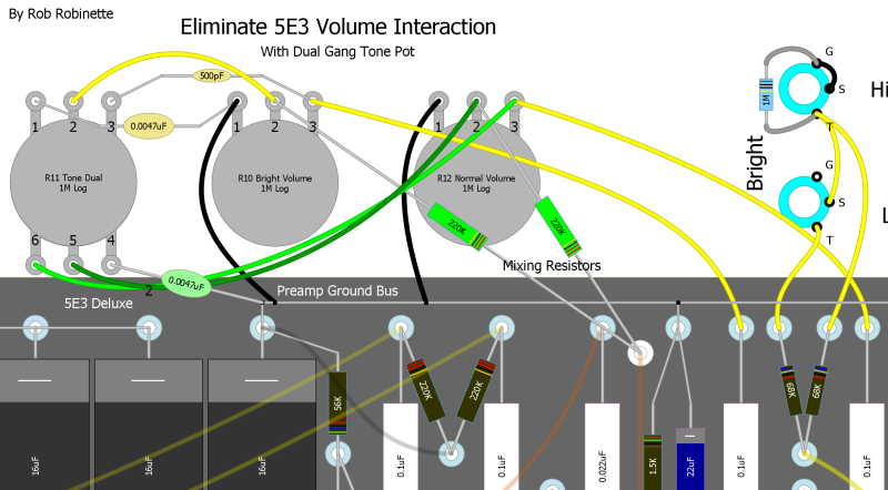 The PRE Phase Inverter Master Volume is my recommended master volume modification for the 5E3. The mod simply replaces the phase inverter's (V2A) 1M grid leak resistor with a 1M log or audio pot. With the Master Volume full up the 5E3 circuit is completely normal--it's as if the MV isn't there so it won't change your amp until you dial down the volume. It also allows you to dial out nasty 'double frequency' phase inverter blocking distortion, control the balance between preamp and power tube distortion and of course practice with dirt at lower volume--especially when paired with a boost pedal.