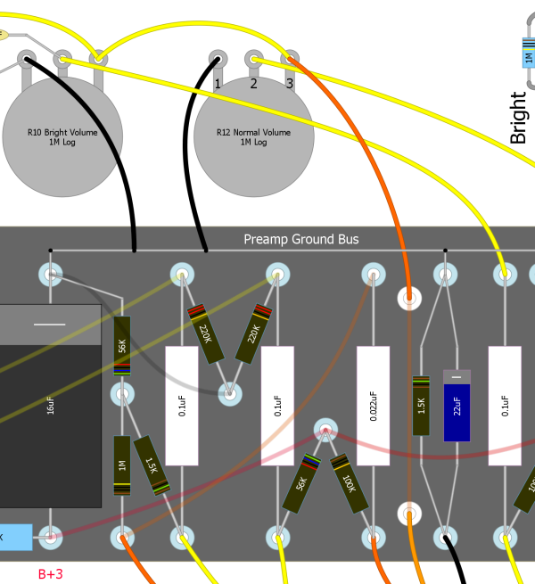 You do not have to remove the under board wire that runs from the top of the 0.022uF cap to the 1M grid leak resistor (wire shown in light orange in layout above) just clip either leg of the 1M resistor and bend it up slightly so it won't make contact with anything. If you clip it right at a solder joint it will be easy to reverse the mod at a later date. Of course you can remove the resistor if you prefer.