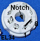 Jumper soldered between pins 1 and 8 to tie EL34 suppressor grid to the cathode. The jumper has no effect on 6L6, 6V6 or KTxx tubes.