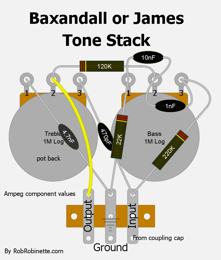 The Vox Cut Control connects the two power tube grids with a 220k audio pot and 4.7nF (.0047uF) capacitor to allow variable high end cut. In a push-pull amp the guitar audio signals on the two power tube grids are 180 degrees out of phase with one another so mixing them together nullifies the signal, kind of like mixing matter and antimatter. The capacitor limits the effect to high frequencies but if you jumper around the cap the pot becomes a Trainwreck Type-3 Master Volume.