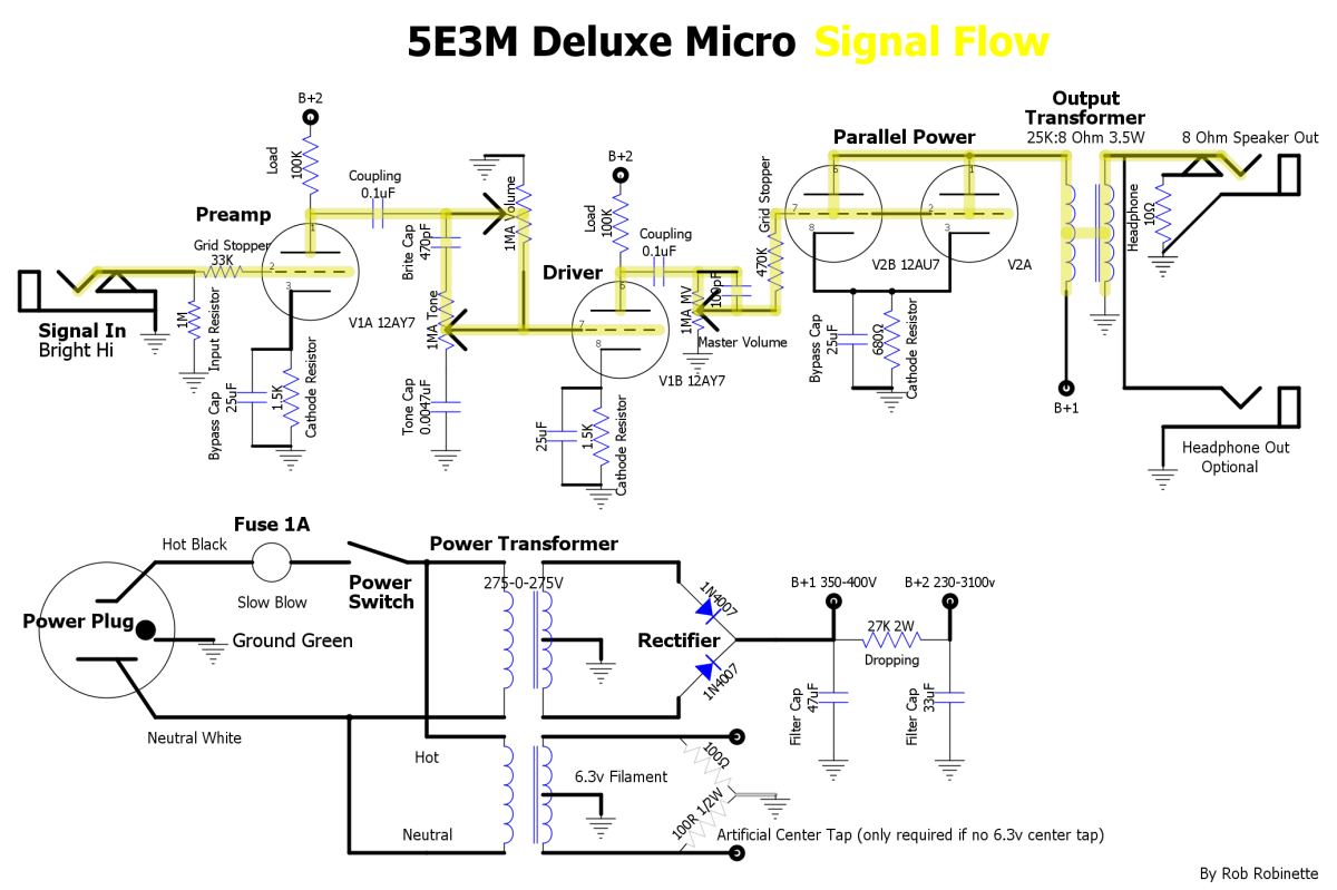 5E3M Deluxe Micro© Guitar AmplifierHave comments or corrections? Email rob at: robinette at comcast dot net UpdatesJanuary 2021: I added an EF80 small pentode version of the Deluxe Micro. It has two channels and uses the 5E3 cathodyne phase inverter. December 2020: Here is an excellent demo of a Deluxe Micro. June 2020: Added Alan Gilsmith's Stereo Deluxe Micro audio amp. March 2020: I bumped the power tube cathode resistor up to 820 ohms to cool the bias and added a Deluxe Micro Hoffman Board file you can upload to the Hoffman DIYLC File Analyzer page and have a board made. May 2016: Here's a good quality sound clip that showcases different styles on Deluxe Micro #4. Sep 2015: Deluxe Micro #3 builder Ty says, "Well, after the honeymoon is over and getting more familiar with the deluxe micro the more I love that thing. It is brilliant for home playing. The master volume is an absolute, like you said on an amp like that. I'm for sure going to build the Bassman Micro as soon as I have some strange cash. Keep up the good work! I finally got some recording done with the amp. So, on the dirt side I'm using a bjfe sea blue EQ and black arts tone works pharaoh. On the clean and dirty I am using a belton brick reverb and Mxr 10 band EQ. There are some glitches and knocks in it, oops. Didn't have time to refine it. Anyways, let me know what you think!!!!" Here's Ty's demo in mp3 and FLAC. May 2015: Last change I swear. The ClassicTone 40-18028 300-0-300V power transformer gave me a power tube plate voltage of 417v which is hotter than I wanted. I added a pair of parallel 442 ohm 1/2 watt resistors (equivalent to a 221 ohm 1 watt resistor) between the rectifier tube and first filter cap to bring the plate voltage down to 400v. I intentionally left space for an extra dropping resistor on the circuit board for this very reason. 27 April 2015: Here's a short youtube clip of Deluxe Micro #3 by its builder. 23 April 2015: Added a self-split push-pull power tube option. The Deluxe Micro design is an attempt to capture the magic of the late 1950's classic Fender tweed 5E3 Deluxe tube guitar amplifier in an easy to build, two tube, 1 watt output practice amp. The Deluxe Micro's single channel preamp circuit was inspired by the 5E3 Deluxe's Bright Hi channel. Both triodes of the V1 12AY7 are used as gain stages. The power amp is simply a single-ended Class A design using a 12AU7 tube with both triodes strapped together (paralleled) feeding an $18 ClassicTone 25K to 8 Ohm reverb transformer rated at 3.5 watts as the output transformer. If you prefer to stick with a more 5E3 like push-pull amp I added an option for a very simple self-split push-pull power amp using the 12AU7. I also offer up a more complex Deluxe Micro Mod with added tone shaping switches to add versatility. One thing to consider is if you build the Deluxe Micro and don't like it, the power transformer and tubes can be used in a full size 5E3 Deluxe and other tube amp kits. WARNING The Deluxe Micro project utilizes POTENTIALLY FATAL HIGH VOLTAGES. If you are unfamiliar with high voltage circuits or are uncomfortable working around high voltages, DO NOT RISK YOUR LIFE BY BUILDING THEM. Seek help from a competent technician before building any unfamiliar electronics circuit. RobRobinette.com DISCLAIMS ALL LIABILITY FOR INJURY OR PROPERTY DAMAGE RESULTING FROM THIS INFORMATION. ALL INFORMATION IS PROVIDED 'AS-IS' AND WITHOUT WARRANTY OF ANY KIND. See more tube amplifier safety info here. Eyelet or Turret Board LayoutOne 12AY7 and one 12AU7 are all that's needed in the Deluxe Micro. Note the optional four diode rectifier on far left of circuit board and V3 EZ81 rectifier tube at bottom left--choose one rectifier. Click the image for the hi-res image. Here's the hi-res pdf layout. Download the DIY Layout Creator file here. Shown with simple four diode rectifier. Layouts below show optional EZ81 tube rectifier if you prefer an all tube amplifier. Click on the image to see a hi-res pdf of the schematic (this is true of all the layout diagrams on this webpage). You can download the DIY Layout Creator file of the schematic here. Deluxe Micro Bill of Materials