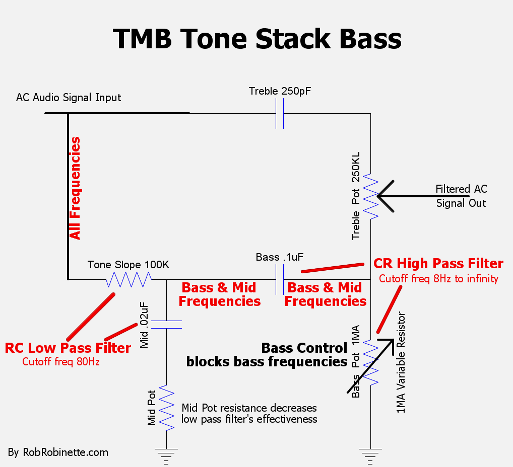 An RC (resistance-capacitance) low pass filter has a resistor first followed by a capacitor connected to ground. A low pass filter allows low frequencies to pass but high frequencies are blocked. The TMB tone stack has only one low pass filter. A CR (capacitance-resistance) high pass filter has the capacitor first followed by a resistor connected to ground. A high pass filter allows high frequencies to pass but blocks low frequencies. The TMB tone stack has three high pass filters.
