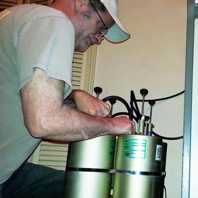 444.6MHz is the repeater transmit frequency, 449.6 is the receive frequency. The signal from the repeater transmitter enters at the left LOW connector, then has 449.6MHz filtered out by the three Low cavity notch filters. The signal then goes out the ANT connector to the repeater antenna. The transmit and receive signals come in from the ANT connector, has the 444.6MHz transmit signal filtered out by the High notch filters, then goes out to the repeater receiver through the HIGH connector. Note that the notch filters work in both directions. The 633-6A-2N is a pass/reject notch filter duplexer but there are also more expensive band pass filter and band pass reject filter duplexers. Notch filter duplexers are not suitable for repeater sites with other transmitters because they only filter the transmitter they are tuned to, not other nearby transmitters. Use band pass or band pass reject duplexers at sites with multiple transmitters. Band pass reject duplexers are typically what you will find on crowded mountain top repeater sights. Band pass reject duplexers use both pass band pass and notch filters to remove all RF signals except the repeater transmit and receive frequencies. Note that I am using a small, 50 watt UHF duplexer. VHF duplexers are much larger due to wavelength and tight 0.6MHz repeater split. They are typically much more expensive than UHF duplexers. Hamventions are the best place to find good deals on duplexers and other repeater parts. Large VHF Repeater Duplexer