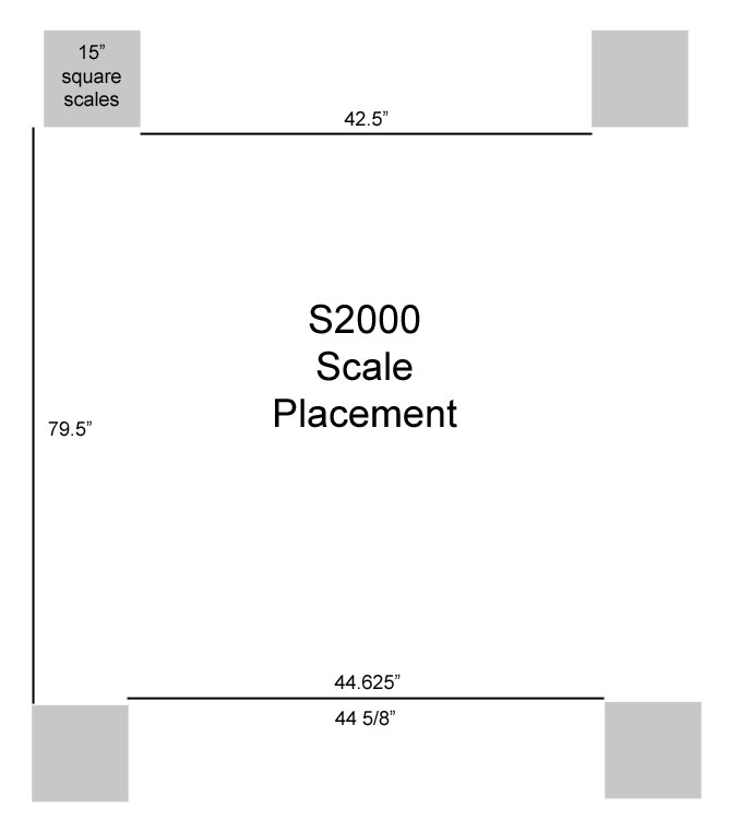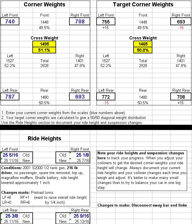 On The ScalesI created a Microsoft Excel spreadsheet do the following corner weight calculations: Corner_Balance.zip The spreadsheet's second page has a good article that goes into more detail of how and why to corner balance a car. You can see the article here: Grassroots Motorsports » Understanding Corner Weights This spreadsheet will also give you an estimated center of gravity height if you raise the rear of the car 10 inches or more and re-weigh it. The CG height values shown below are totally fictional. You can also use this online calculator to compute your corner weights: Corner Weight Calculator if you don't use Microsoft Excel. You can estimate your car's center of gravity (CG) height by using this online calculator: CG Height Calculator I used these scales to weigh the car: Intercomp SW500 EZ Weigh Scales The following are screen shots from the Corner_Balance.zip Excel spreadsheet. Note the "Conditions and Changes Made" box in the "Ride Height" section of each spreadsheet. First some baselines. Here's a box stock 2006 Honda S2000 with 5/8 of a tank of gas, and no driver or passenger: