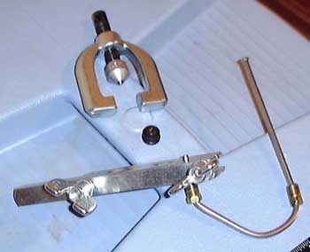 Double-flare tool with pipe clamped, ready to flare (note both flare nuts are in place on pipe)