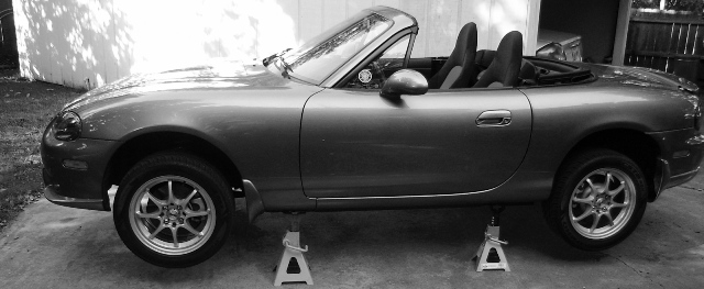 1.) The car will need to go up on 4 jack stands, or as an alternative, drive the car up on a pair of ramps, then jack up the rear end and put the rear of the car up on 2 jack stands. I prefer this method.
