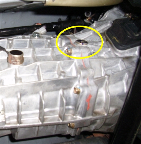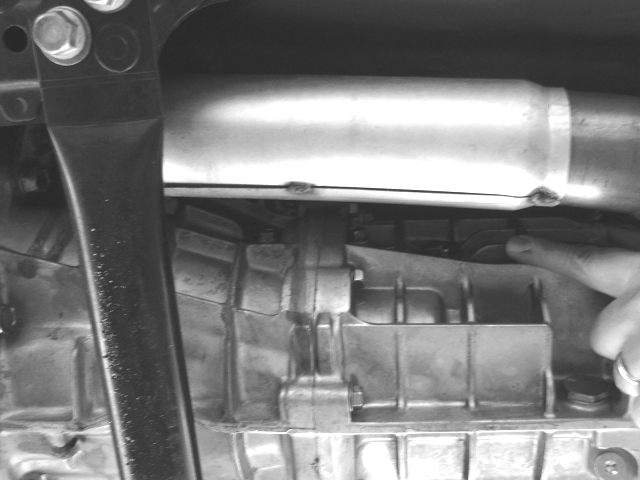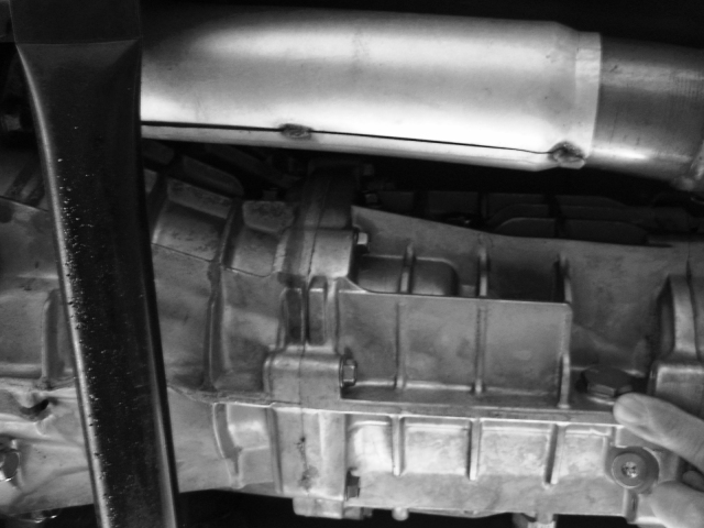 Instead, you'll want be removing the FILL and DRAIN bolts. They're on the Driver's side of the transmission tucked in close to the exhaust pipe! Here's the Fill Bolt (see finger):
