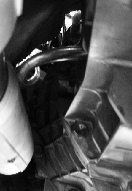 10.) Time to snake one end of the clear tube down from the engine bay to INTO the FILL hole in the transmission.