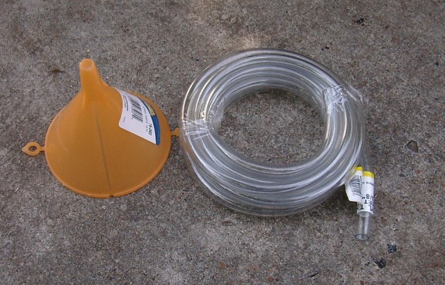 A small funnel and about 5' of 1/2 diameter clear tubing. You can get both for less than $4.00 at your nearby Home Depot.