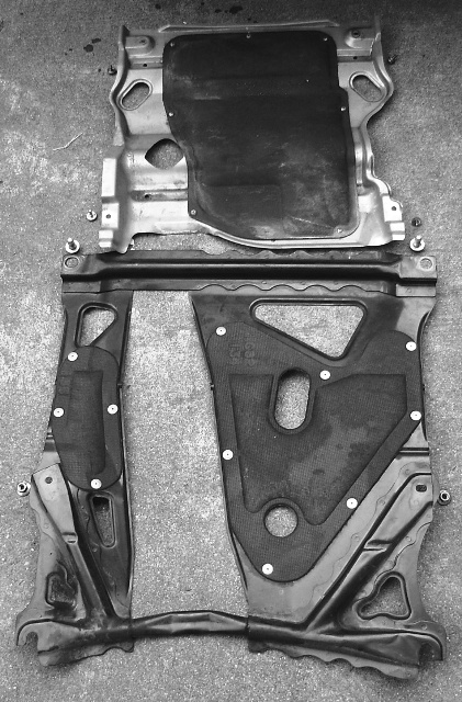 Remove the larger black shield in the middle of the car first. Use a 14mm socket to loosen (but NOT remove) the 2 rear-most nuts, the same socket to REMOVE the 2 middle nuts, and a 17mm socket to remove the 2 large BOLTS at the front of the shield. It is a bit heavy, so be careful removing it. The two rear nuts can stay on the car, and they'll help when you re-install the shield.