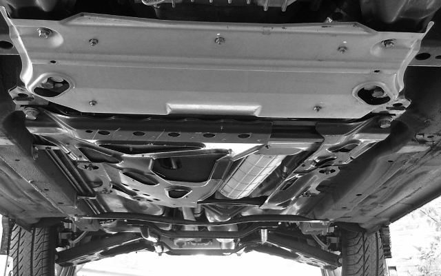 3.) Under the car, (pic is looking towards the back) there are 2 shields. A front silver one, and a larger black one in the middle of the car.