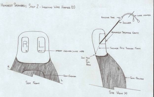 I laid an old carpet on the ground, then carefully lifted the driver seat out of the car and set it down on the carpet next to the car. I unzipped the headrest zipper and pulled the seat trim down to reveal the foam on both sides of the seat. Next, I removed the plastic cover of the headrest to reveal the factory-molded holes for the headrest speakers. I then took the skewer and adhered on its end, the loose end of one of the wire harnesses that came with the speakers with some paper adhesive tape. I pulled on it a bit to ensure it had adhered properly. Looking at the back of the seat, I noticed two small (2mm) holes on either side of the seat, approx. 1½ inch lower than the bottom of the molded headrest speaker hole