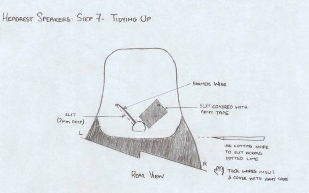 The process of finishing the installation involves a couple of “cosmetic” modifications to the installation in order to ensure that the wire harness does not show through the cloth or vinyl of the seat. Looking at the back of the seat, at the level of the headrest speaker holes, you will see two lengths of wire about 2 inches long (these are the loops of wire that hang over the foam of the seat back, as a result of the threading of the wire harness through the bottom of the headrest speaker mount hole to the back of the seat and then rethreading it through the seat foam all the way to the front of the seat. I figured that after closing the seats up, these wires would “show through” the vinyl of the seat back, so I took a blade knife and carved a 2mm deep slit along the path of both wires. I then pushed the wires into the slit in the foam, and taped the foam with some army tape. Although the foam of the seat is quite heavy, thereby eliminating the danger of it parting sometime in the future and creating gaps in the back of the seat, I taped the slits closed as well to add some extra rigidity to the foam where it was weakened due to the cutting.