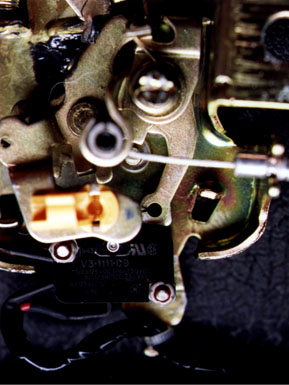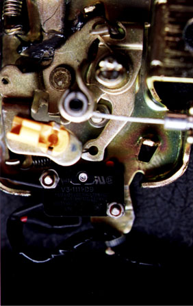 Hold the switch in position and operate the latch a few times to make sure the button on the switch is being pushed down enough to make contact, but not so much as to cause the lever to contact the switch body. To close the latch, rotate the catch at the top clockwise until it clicks. To unlatch it, move either the rod attachment point or the cable attachment to the right (looking at the back of the latch). When you are confident the switch is positioned correctly, mark the location of the two screw holes on the trunk latch and drill the latch for the screws.