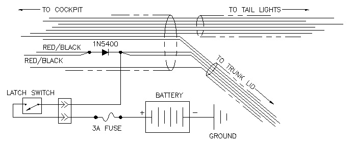 Attach both of the ends of the wires leading into the cockpit to the un-banded end of the diode. Dont let the fact that we are tying these wires together bother you. They are actually combined farther back in the wiring harness. It was just easier to make the attachment here than way back under the package shelf. Be sure to solder this connection securely. Now we are going to attach the other ends of the cut wires (the ones leading into the trunk lid) along with the wire from our latch switch to the banded end of the diode. Solder this connection securely too. Here is what the diode and the wires should look like: