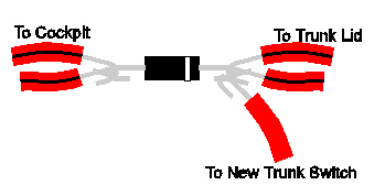 Now to work on the business end of the wiring. On the right trunk hinge, near the trunk lid, the wire harness is held on with a harness tiedown. Press the little "arrowhead" on the back of the hinge together and pop it back through the hinge. There is another one of these tiedowns on the harness in the trunk right before it "Ys" off to the trunk lid. Pop this one loose too. Remove the black tape for 3 to 4 inches on all three legs of the "Y" at the trunk hinge. You will also need to remove the orange tape and the tiedown from the harness. On the branch that goes into the trunk lid, locate the two small RED wires with a BLACK STRIPE. Trace these wires back into the branch that goes towards the cockpit. Cut both of these wires about 2" back towards the cockpit from the "Y".