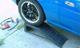 The hardest part of the job is getting these old bones up and down from the ground. The taller ramps provide enough space to work easily by crawling under the passenger rear bumper. Not shown, but the front wheels are chocked in both directions. Big difference in being lazy versus being stupid! Have all tools handy for easy reach.