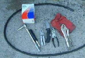 Hunk of 5/16" fuel line in the event that you may need to replace a section, rag, socket for the filter bracket, assorted pliers and 4 in 1 screwdriver, since we're unsure of what clamps will be on the hoses. The knife can be used to cut hoses as needed and also serves as a lever to pry up any damaged plastic screws securing the cover. You may not need all of the stuff, but plan to make a minimum amount of trips underneath.